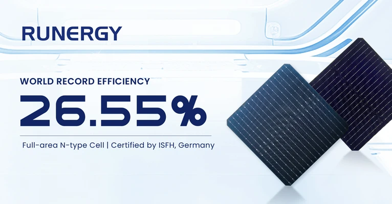 Jiangsu Runergy New Energy Technology Co., Ltd. (“Runergy”) has announced that its independently developed M10 full-area N-type solar cell has achieved a conversion efficiency of 26.55%, as certified by the Institute for Solar Energy Research Hamelin (ISFH), Germany.